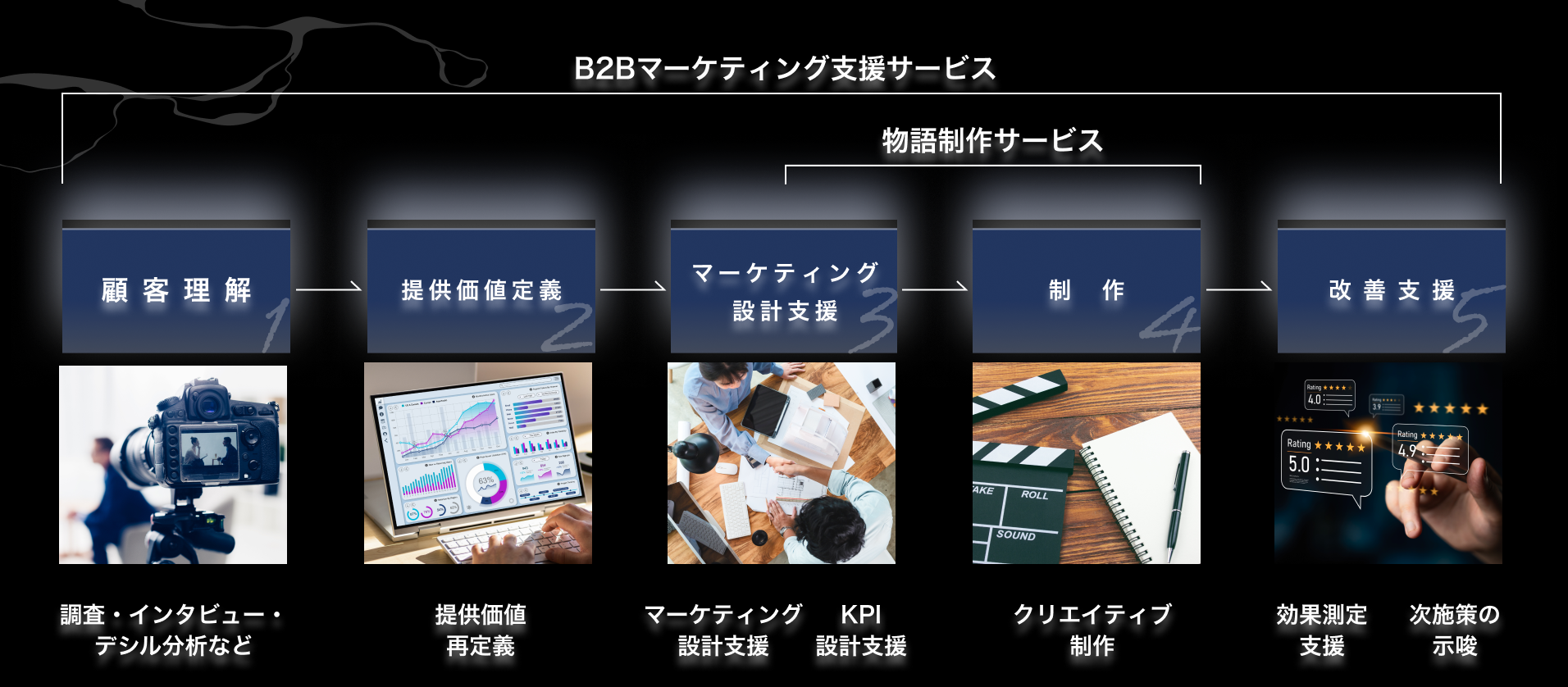 私たちの提供する物語るは、主に4分野へと適応可能ですが、その中でもB2B企業のマーケティング活動への貢献について