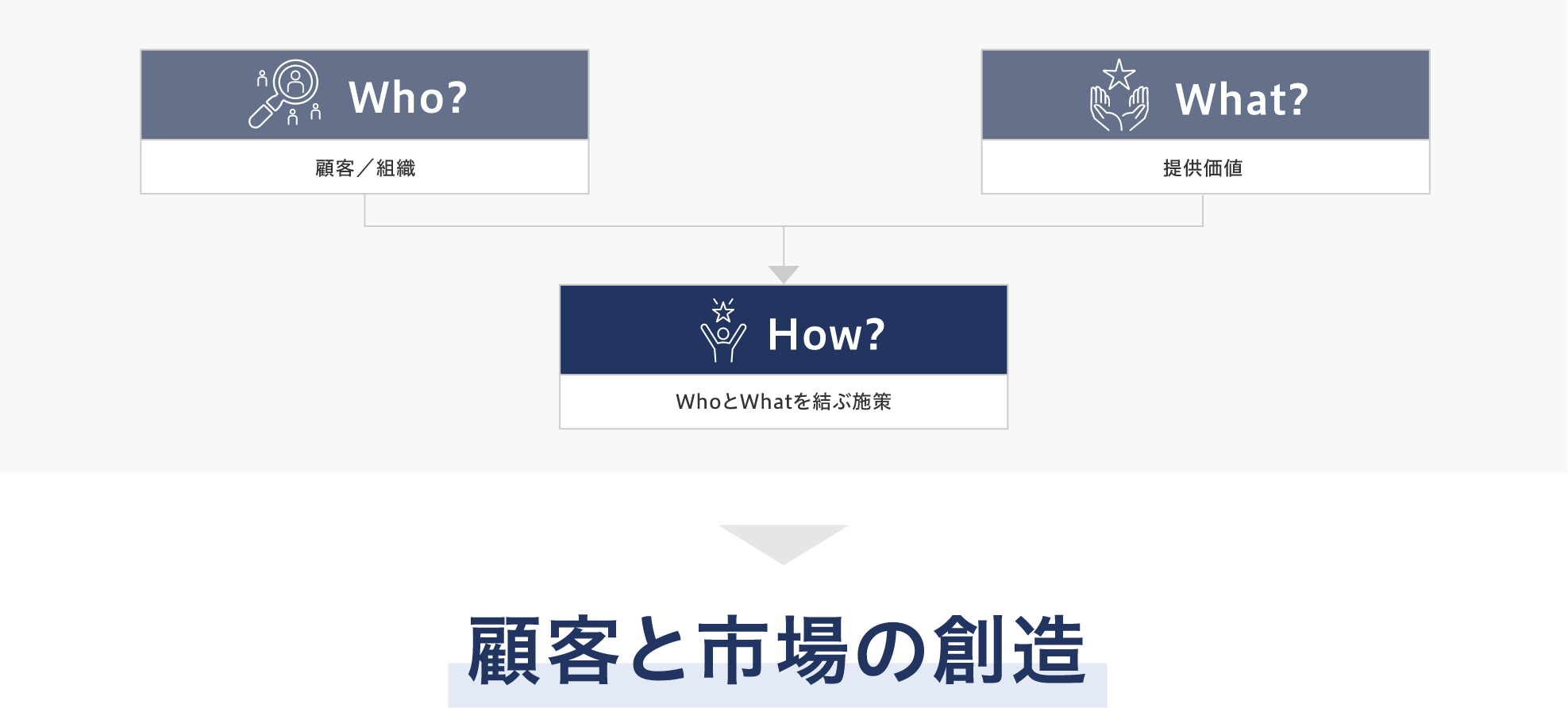 私たちは煩雑化してしまったマーケティングの現状をとらえなおすために、本質的なマーケティングの役割について再度定義をしてみました。それは以下の図のようになり、明確な戦略設計と戦略の実行と考えます。そして戦略設計とは「Who?(顧客や顧客組織)」と「What?(製品・サービスの提供価値)」の定義とその組み合わせです。また、Who?とWhat?を結びつける施策の実行をすることで市場や顧客が開拓されていきます。さらに、マーケティングという機能の本来の目標は、「顧客と市場を創造する」ことであるとここで定義します。